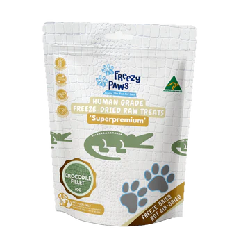 Australian Superpremium Human Grade Freeze-dried Crocodile Fillet Raw Treats 100% Human Grade. Only 1 ingredient, responsibly sourced. Super lean novel Protein. Freeze-dried retains nutrients and the natural flavour of raw meat High-protein, all-natural treat Bite-sized for easy eating and portion control Great for reward training and as a nutritional boost to any pet’s diet Naturally hypoallergenic and gentle on the stomach No preservatives, no fillers, and no artificial flavours/colours Grain-free, gluten-free, soy-free, corn-free, and guilt-free! Made in Australia in small batches. Crocodile fillet can provide several benefits for pets when included in their diet. Here are some potential benefits: Nutritional Value: Crocodile meat is a lean source of protein, which is essential for building and repairing tissues, supporting a healthy immune system, and promoting overall growth and development in pets. Novel Protein Source: Crocodile meat is considered a novel protein, meaning it is not commonly found in most pet foods. For pets with food allergies or sensitivities, introducing a novel protein source like crocodile can be beneficial in managing or avoiding adverse reactions. Low Fat Content: Crocodile meat is naturally low in fat compared to other meats like beef or pork. This can be advantageous for pets that require a low-fat diet, such as those with certain health conditions like pancreatitis or obesity. Omega-3 Fatty Acids: Crocodile meat contains omega-3 fatty acids, which offer numerous health benefits for pets. Omega-3s can support a healthy coat and skin, reduce inflammation, promote cardiovascular health, and enhance cognitive function. High Mineral Content: Crocodile meat is rich in minerals such as phosphorus, zinc, and iron. These minerals play crucial roles in maintaining bone health, supporting the immune system, and ensuring proper oxygen transportation in the body. Palatability: Many pet owners find that their pets enjoy the taste of crocodile meat, making it an appealing option for pets with picky appetites or those that need a little extra encouragement to eat. Our freeze-dried raw meat treats have never been cooked or processed in any form whatsoever. The superior freeze-dried method preserves food naturally, so there are no added chemicals or preservatives that are found in common pet foods and treats. Even better, all the natural vitamins, minerals, nutrients, and the great taste of real, raw Crocodile Fillet remain the same. Only the best treats. Because they are family.